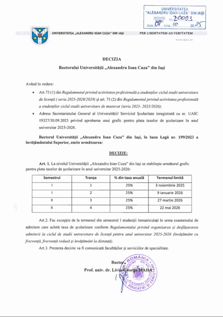 Tranșa II – 25% din taxa anuală de școlarizare până la 22 mai 2026