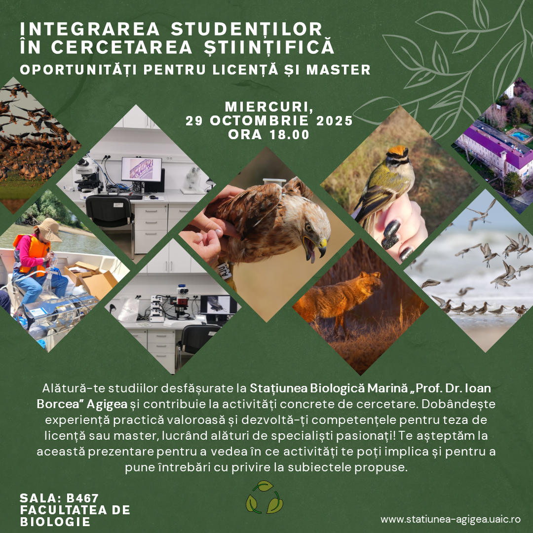 Alătură-te studiilor desfășurate la Stațiunea Biologică Marină „Prof. Dr. Ioan Borcea” Agigea și contribuie la activități concrete de cercetare. Dobândește experiență practică valoroasă și dezvoltă-ți competențele pentru teza de licență sau master, lucrând alături de specialiști pasionați! Te așteptăm la această prezentare pentru a vedea în ce activități te poți implica și pentru a pune întrebări cu privire la subiectele propuse.