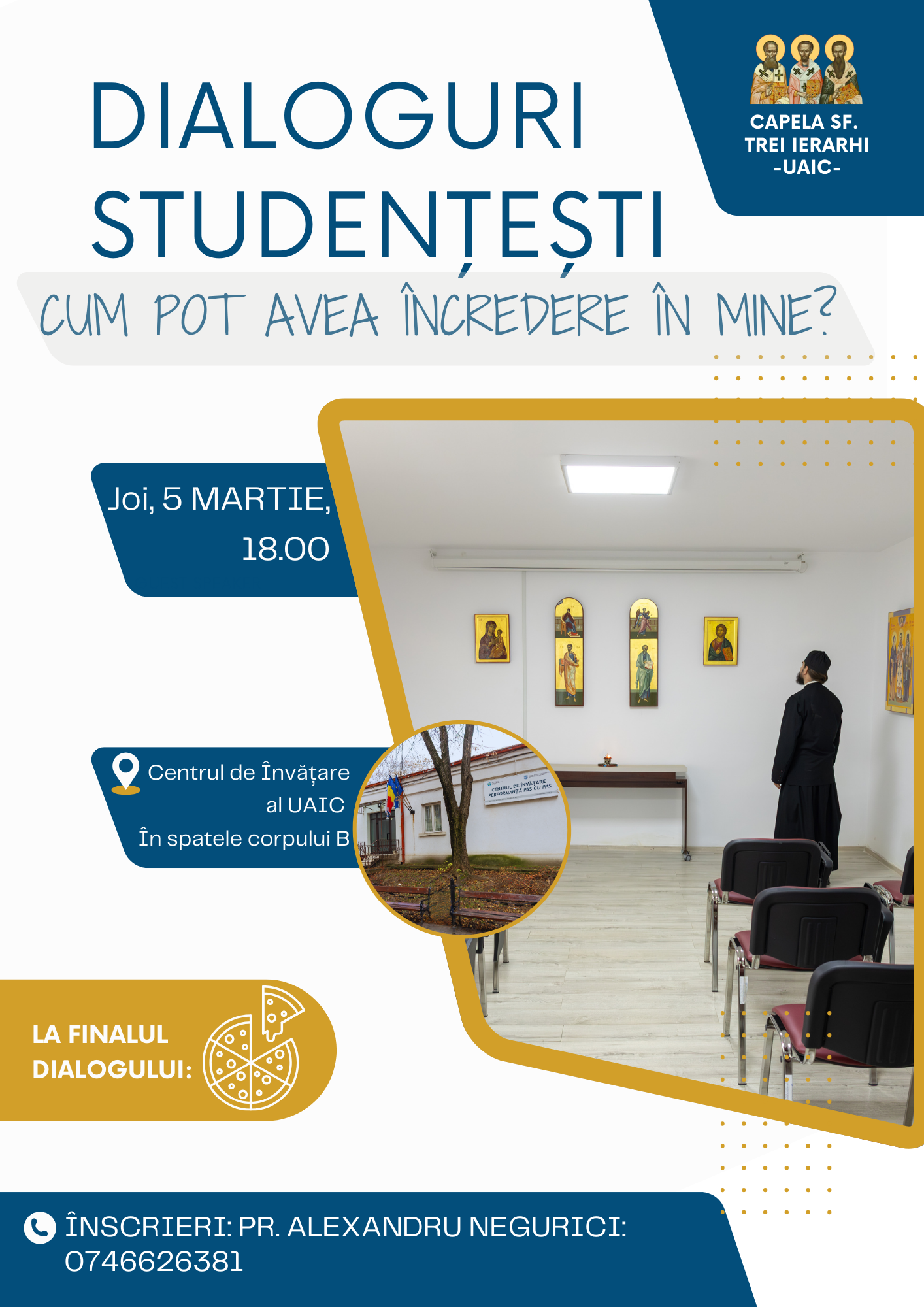 În fiecare joi, de la ora 18:00, vor avea loc dialoguri studențești, unde vor fi abordate teme actuale și provocări reale din viața de student. Tema primului dialog din această săptămână este „Cum pot avea încredere în mine?”, moderat de părintele Alexandru Negurici, responsabil al capelei.