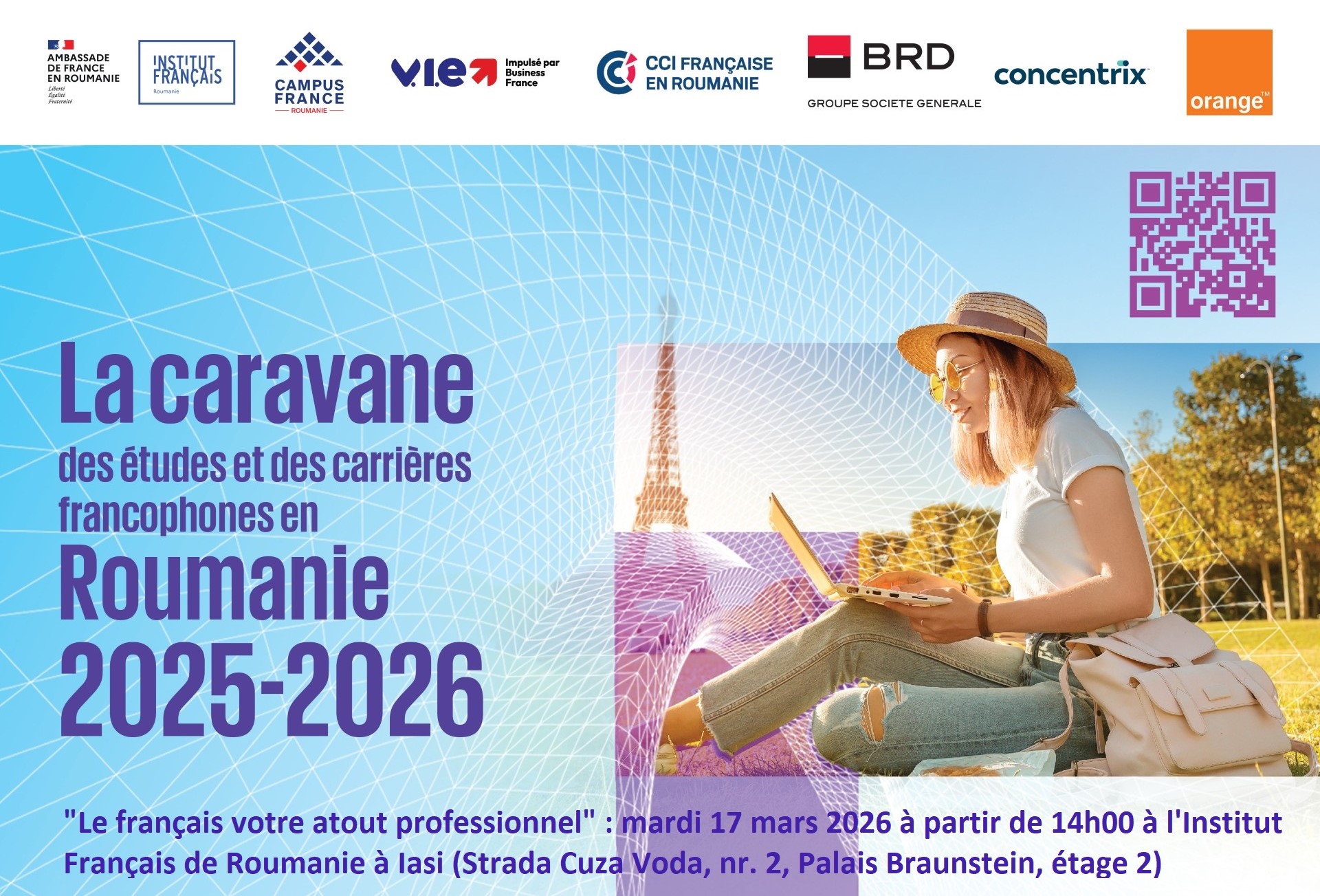 Evenimentul „Limba franceză, atuul dumneavoastră profesional” va avea loc marți, 17 martie 2026, începând cu ora 14:00, la Institutul Francez din România, Iași (Palatul Braunstein, etajul 1), în cadrul „Caravanei studiilor și carierelor francofone” și a lunii Francofoniei.