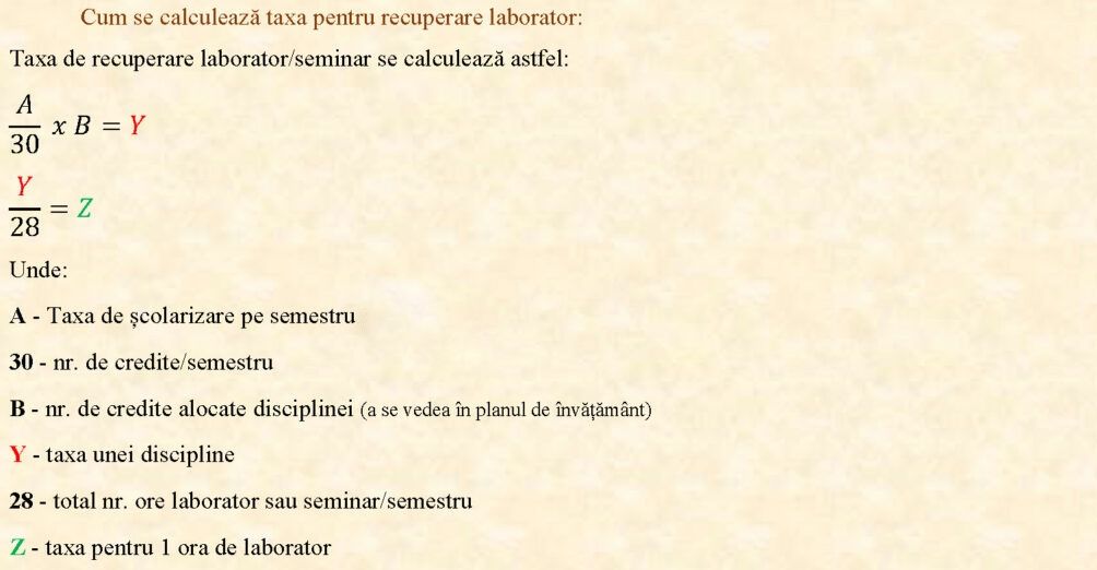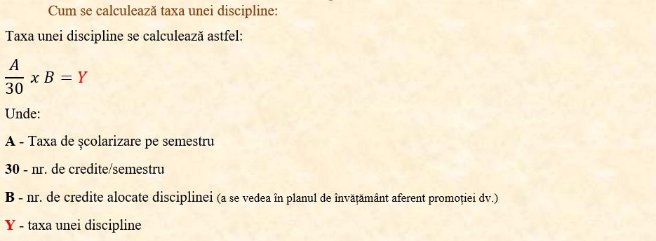 • taxa de școlarizare pe semestrul în curs/30 x numărul de credite alocate disciplinei respective.